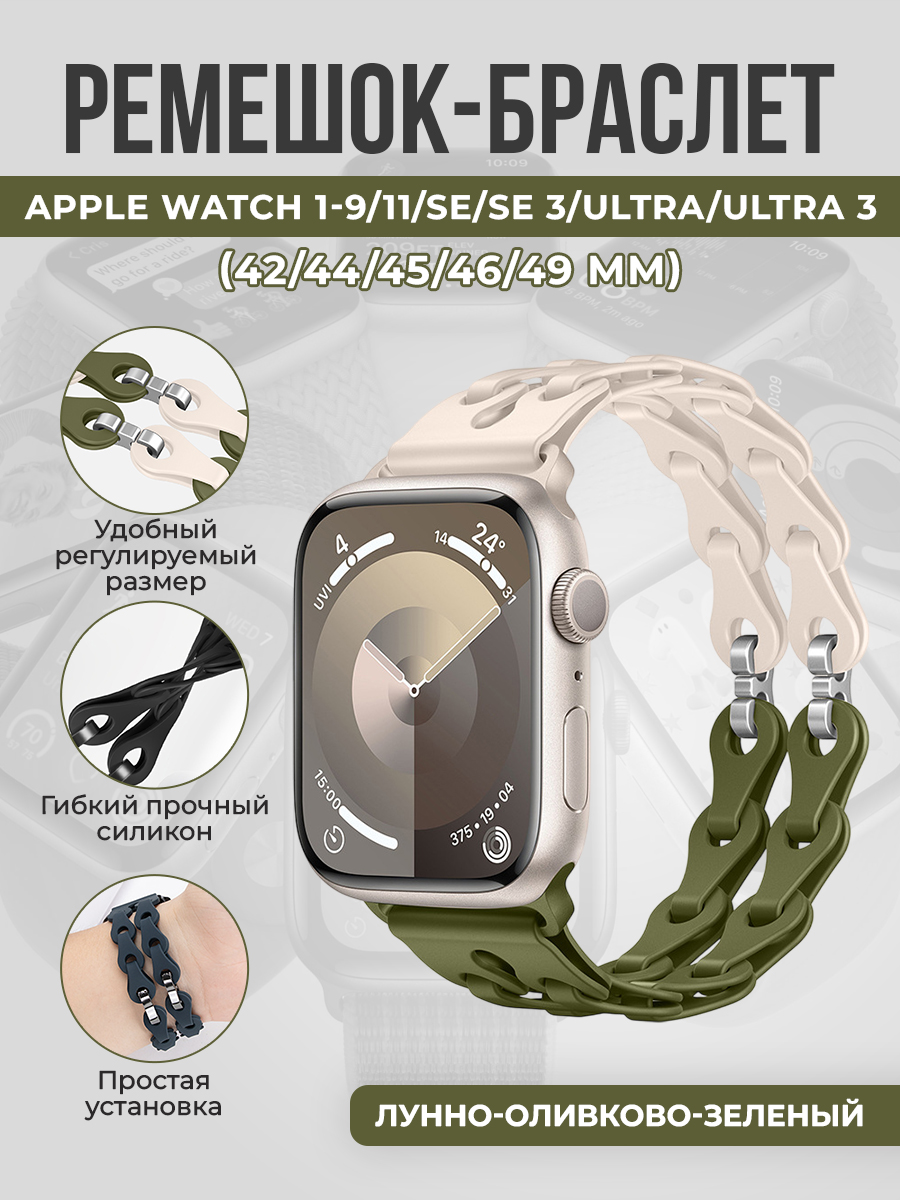 Модный силиконовый ремешок-браслет для Apple Watch 1-9/10-11/SE1-3/ULTRA1-3(42/44/45/46/49 мм) — идеальное сочетание стиля, комфорта и долговечности. Этот ремешок станет отличным дополнением к вашему устройству, превращая повседневное использование в удовольствие и подчеркивая индивидуальность владельца. Он подходит для широкого диапазона моделей, что делает его универсальным решением для тех, кто ценит удобство и современный дизайн. Изготовленный из высококачественного силикона, ремешок приятен на ощупь и мягко прилегает к коже запястья. Гипоаллергенный состав минимизирует риск раздражений, что особенно важно для ежедневного ношения. Силикон обладает отличной эластичностью, благодаря чему ремешок сохраняет форму и не растягивается после длительного использования. Легкость ухода обеспечивает простое удаление загрязнений простой протиркой влажной салфеткой или мыльной воды. Ремешок разработан так, чтобы без проблем подходить к Apple Watch 1-9/10-11/SE1-3/ULTRA1-3(42/44/45/46/49 мм). Благодаря пошагово продуманной системе крепления, вы легко подберете оптимальную посадку на любую руку и сможете быстро заменить ремешок без помощи инструментов. Это особенно удобно для людей, которые хотят менять стиль в зависимости от настроения, событий или спортивной активности. В описании мы используем обозначения, которые помогут вам быстро ориентироваться при выборе: Эппл вотч 1--11, Элл воч СЕ и Эйпл вотч ультра — это ориентиры размера для безупречной совместимости.