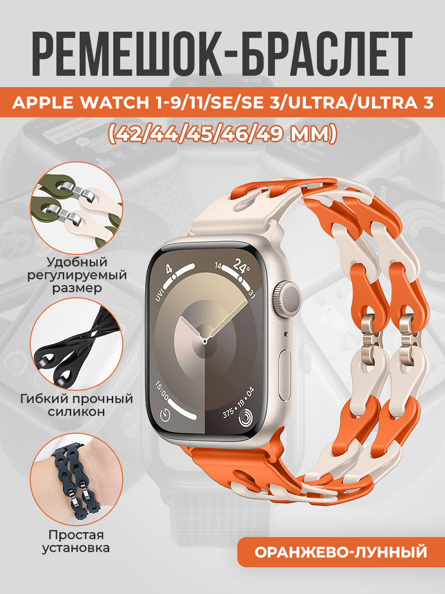 Модный силиконовый ремешок-браслет для Apple Watch 1-9/10-11/SE1-3/ULTRA1-3(42/44/45/46/49 мм), оранжево-лунный