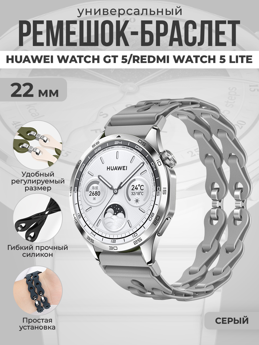 Универсальный силиконовый ремешок-браслет для Huawei Watch GT 5/Redmi Watch 5 Lite, 22 мм, серый