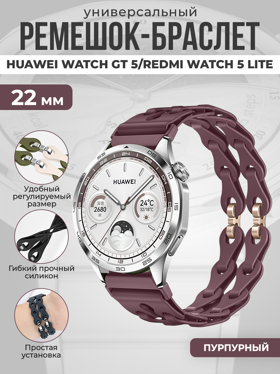 Универсальный силиконовый ремешок-браслет для Huawei Watch GT 5/Redmi Watch 5 Lite, 22 мм, пурпурный