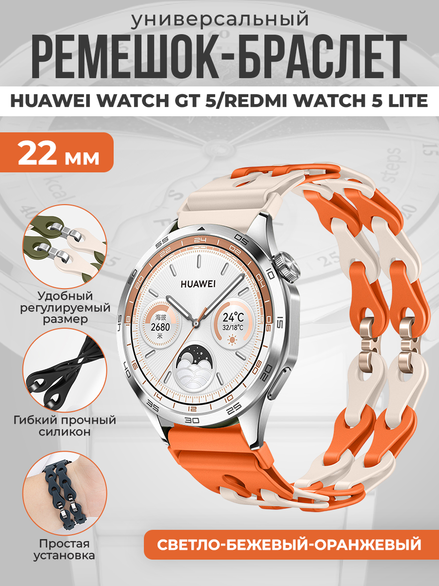 Универсальный силиконовый ремешок-браслет для Huawei Watch GT 5/Redmi Watch 5 Lite, 22 мм, светло-бежевый-оранжевый