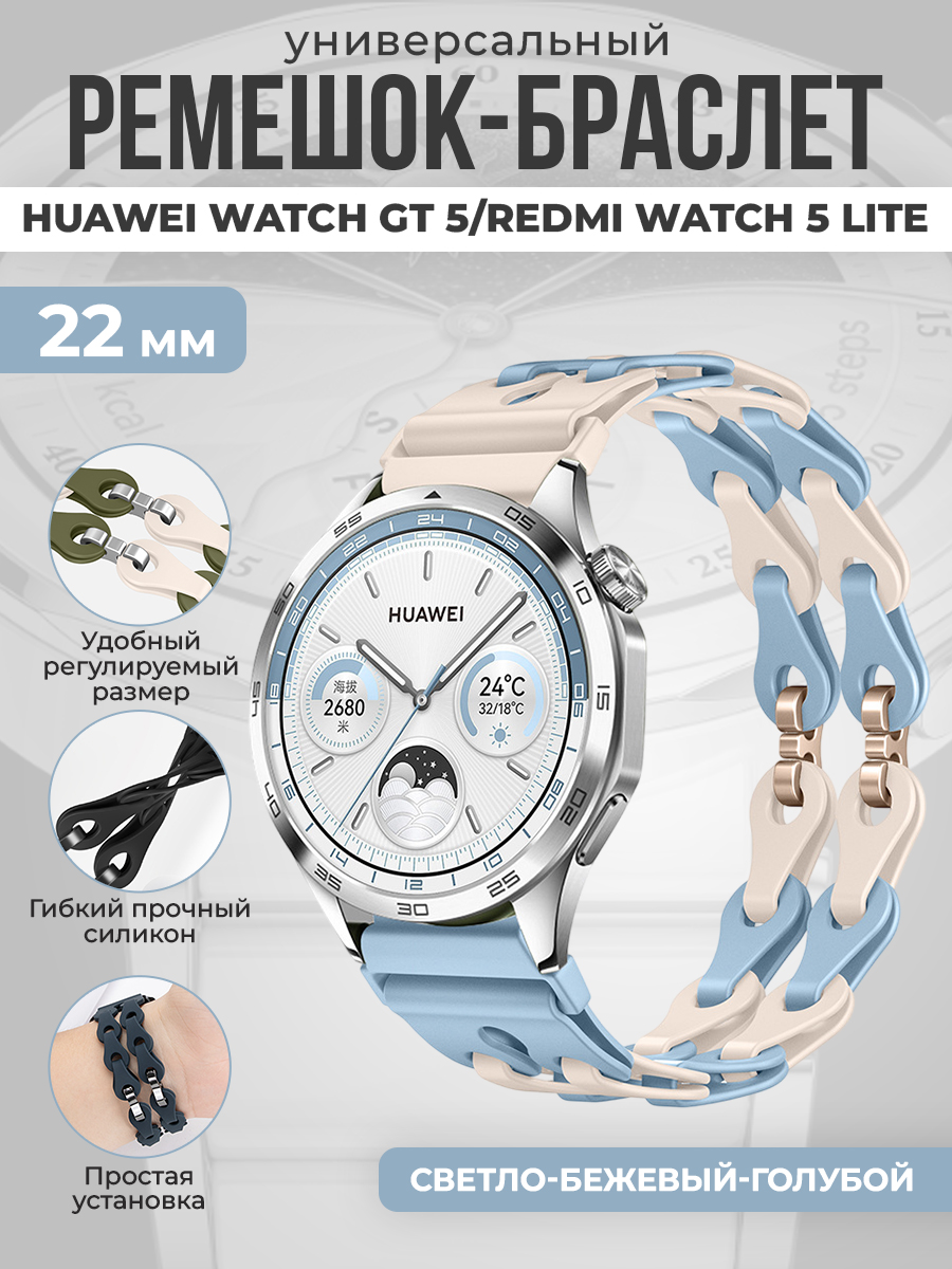 Универсальный силиконовый ремешок-браслет для Huawei Watch GT 5/Redmi Watch 5 Lite, 22 мм, светло-бежевый-голубой