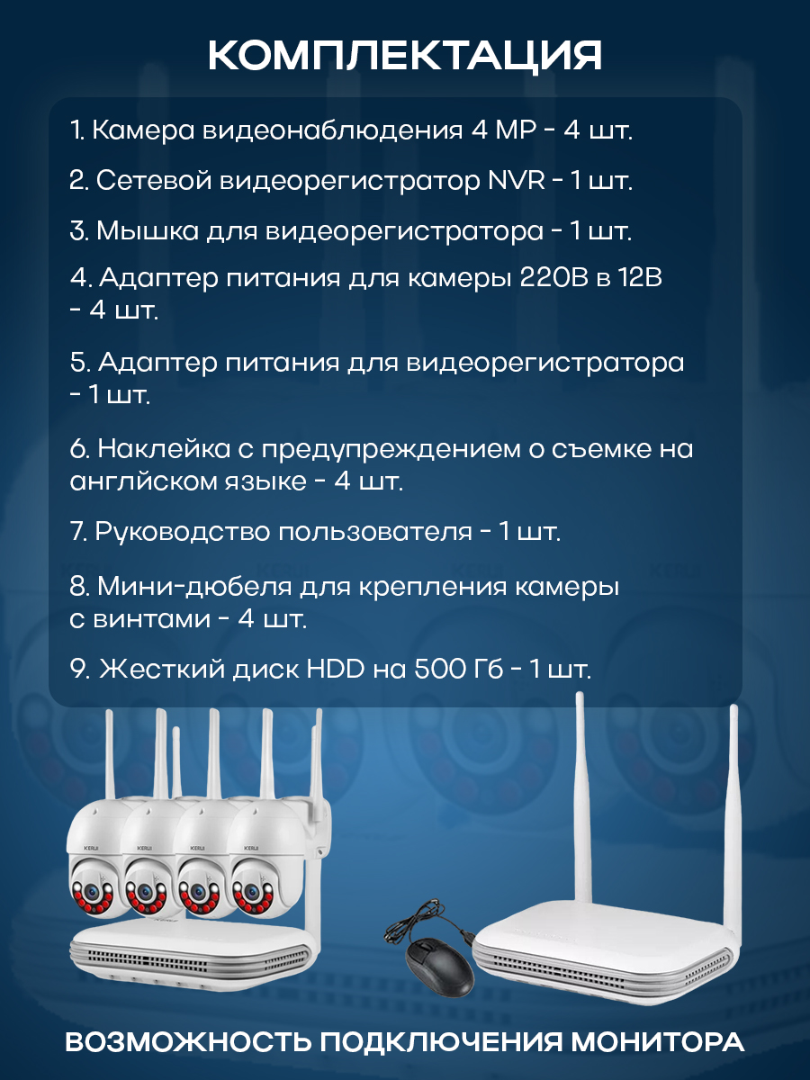 4MP HD беспроводной комплект видеонаблюдения на 4 PTZ WiFi камеры (размер16*10*13), позволяющей осуществлять поворот каждой камеры на 350 гр. по горизонтали и 90 гр. по вертикали с двухсторонней аудио связью. В комплект входит 8 канальный NVR регистратор (размер 12*17*3), позволяющий расширить систему до 8 проводных либо беспроводных камер до 5МП (проводные камеры в комплект не входят). Камеры выполнены в современных стильных корпусах стандарта влагозащиты IP66 и могут использоваться в любых помещениях и на улице независимо от погодных условий. Передача данных с камер на видеорегистратор осуществляется по беспроводной связи на частоте 2.4 ГГц на расстоянии до 100 метров (без преград), что избавит от необходимости прокладывать кабель. Видеорегистратор оснащен системой обнаружения движения, что позволяет получать тревожные уведомления на смартфон и почту, а также производить запись при проникновении на объект. Для просмотра изображения с камер видеонаблюдения в высоком качестве пользователь может подключить видеорегистратор к монитору или телевизору высокого разрешения через HDMI вход. Данный комплект - это инновационное «коробочное решение» для установки видеонаблюдения своими руками.Камеры оснащены встроенной инфракрасной подсветкой для съемки в темноте. Комплект поддерживает удаленный доступ со смартфона и компьютера (при наличии подключения к сети Интернет), при этом просматривать можно как архив записей , так и видео в «реальном» времени. Для подключения и базовой настройки просто: система полностью настроена и готова к эксплуатации. Комплект видеонаблюдения собирается, как конструктор, и Вы с легкостью с этим справитесь. Уникальные преимущества системы:
