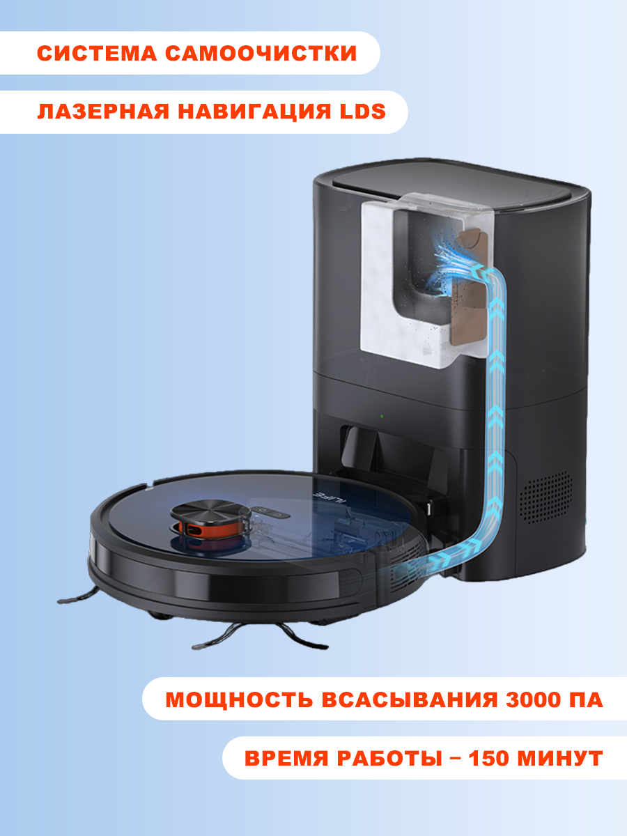 2. Система автоматической очистки использует технологию удаления грязи с мощностью в 20 кПа, которая позволяет очистить пылесборник за 20 секунд.