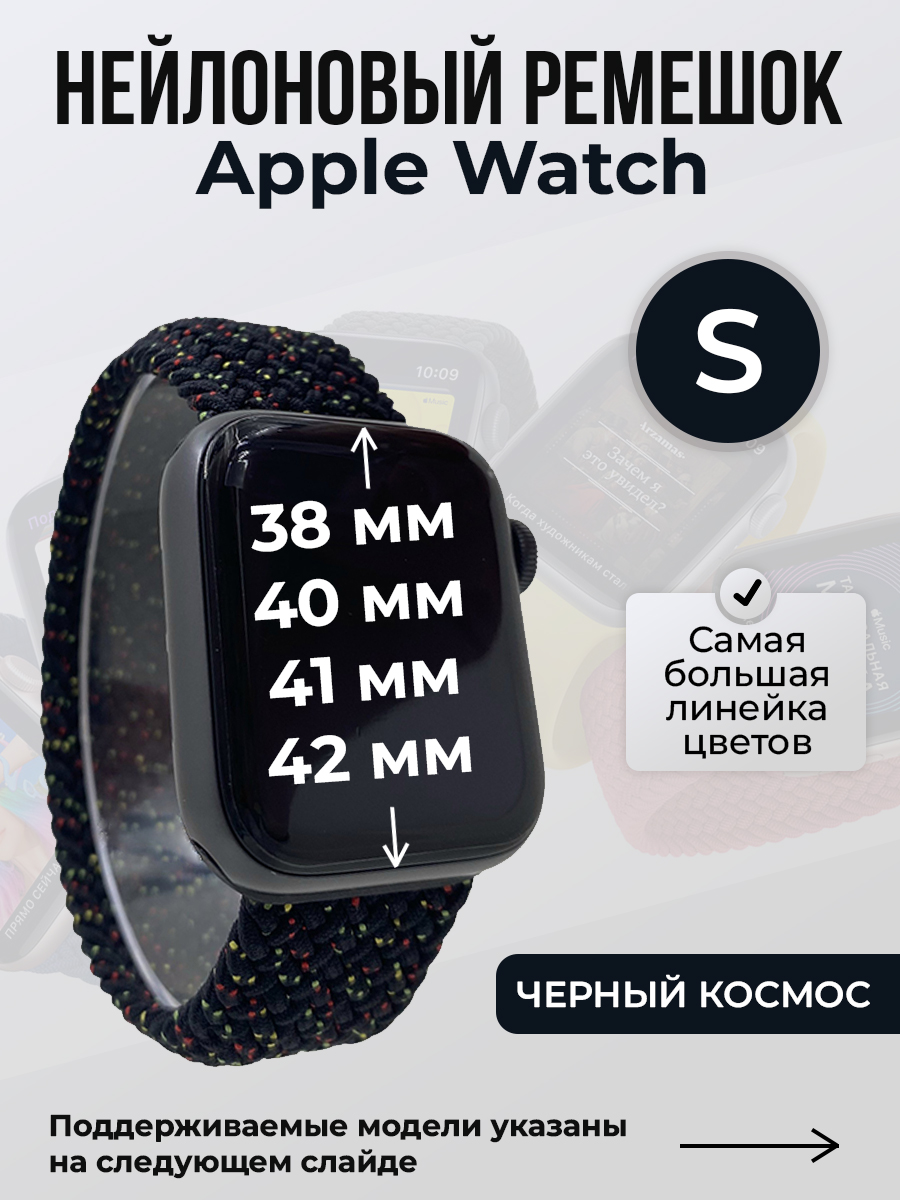Нейлоновый ремешок для Apple Watch 1-9/SE/SE2/SE3 (38/40/41 мм), 10/11/S10/S11, 42 мм, без застежки, черный космос, размер S