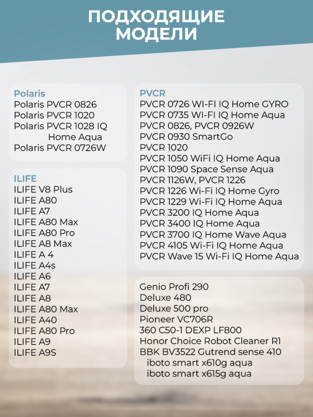 Тряпочка для пола для ILIFE, Polaris. Совместимые модели: Polaris PVCR 0826w, Polaris PVCR 1020, Polaris PVCR 1028 IQ Home Aqua, Polaris PVCR 0726W, PVCR 0726 WI-FI IQ Home GYRO, PVCR 0735 WI-FI IQ Home Aqua, PVCR 0826, PVCR 0926W, PVCR 0930 SmartGo, PVCR 1020, PVCR 1050 WiFi IQ Home Aqua, PVCR 1090 Space Sense Aqua, PVCR 1126W, PVCR 1226, PVCR 1226 Wi-Fi IQ Home Gyro, PVCR 1229 Wi-Fi IQ Home Aqua, PVCR 3200 IQ Home Aqua, PVCR 3400 IQ Home Aqua, PVCR 3700 IQ Home Wave Aqua, PVCR 4105 Wi-Fi IQ Home Aqua, PVCR Wave 15 Wi-Fi IQ Home Aqua. ILIFE A4, A4s, A6, A7, A8, A80 Max, A40, A80 Pro, A9, A9S. Genio Profi 290, Deluxe 480 | Deluxe 500 pro. Pioneer VC706R | 360 С50-1 DEXP LF800; Honor Choice Robot Cleaner R1; BBK BV3522 Gutrend sense 410 iboto smart x610g aqua, iboto smart x615g aqua, V8 Plus.