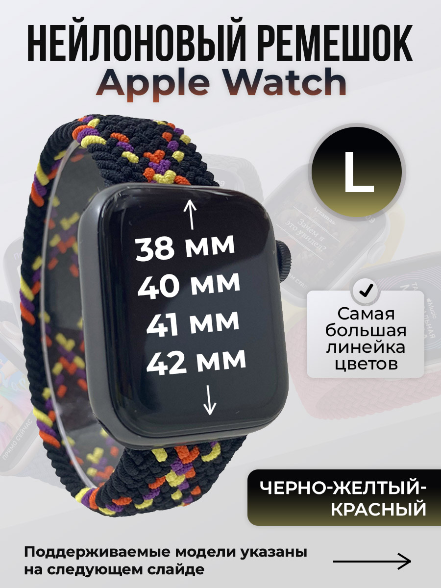 Нейлоновый ремешок для Apple Watch 1-9/SE/SE2/SE3 (38/40/41 мм), 10/11/S10/S11, 42 мм, без застежки, черно-желтый-красный, размер L