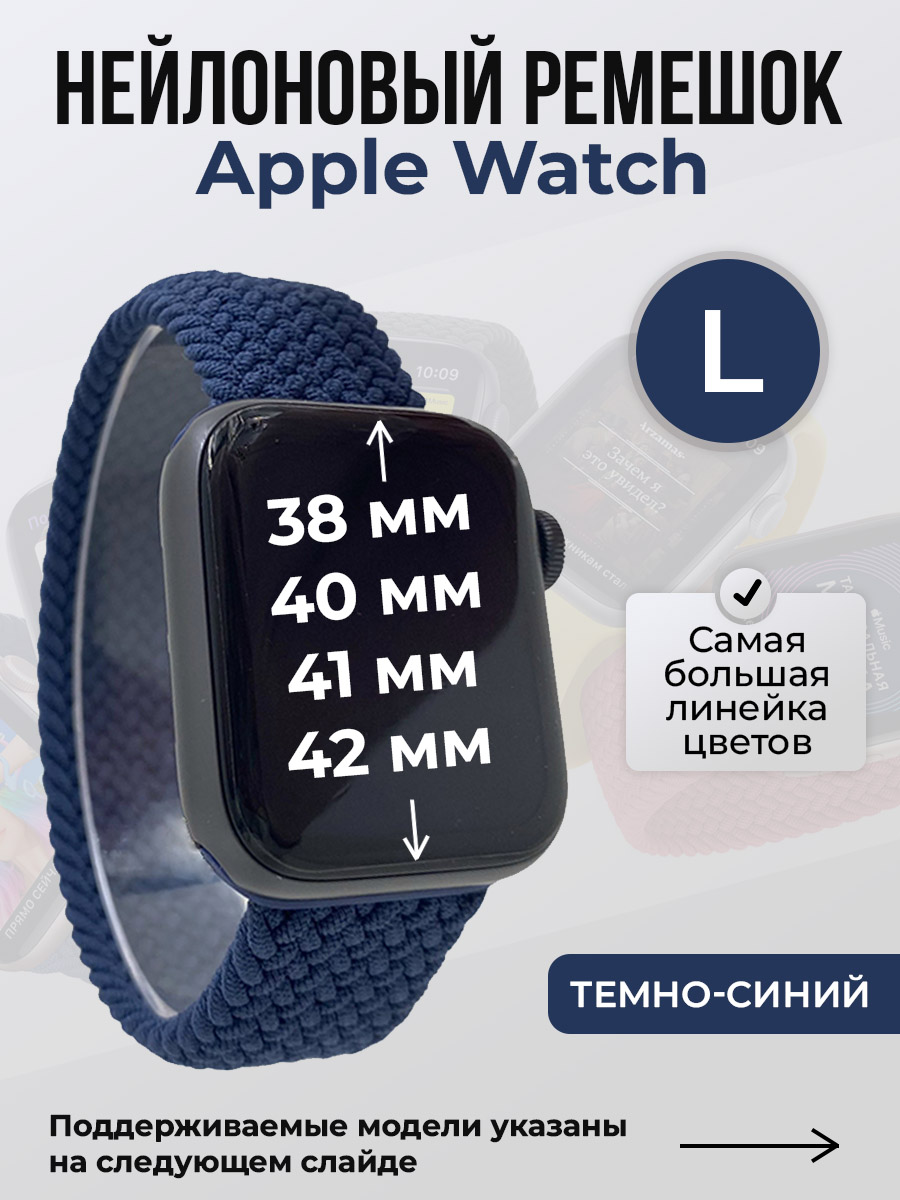Нейлоновый ремешок для Apple Watch, без застежки, размер L подходит для смарт-часов Apple Watch series 1/2/3/4/5/6/7/8/9/SE/SE2/SE3 с размерами циферблата: 38/40/41 мм, а также для Apple Watch series 10/11, S10/S11 с размером циферблата 42 мм. Ремешок для часов iPhone выполнен из гипоаллергенного нейлона. Цвет крепления может отличатся от карточки товара.