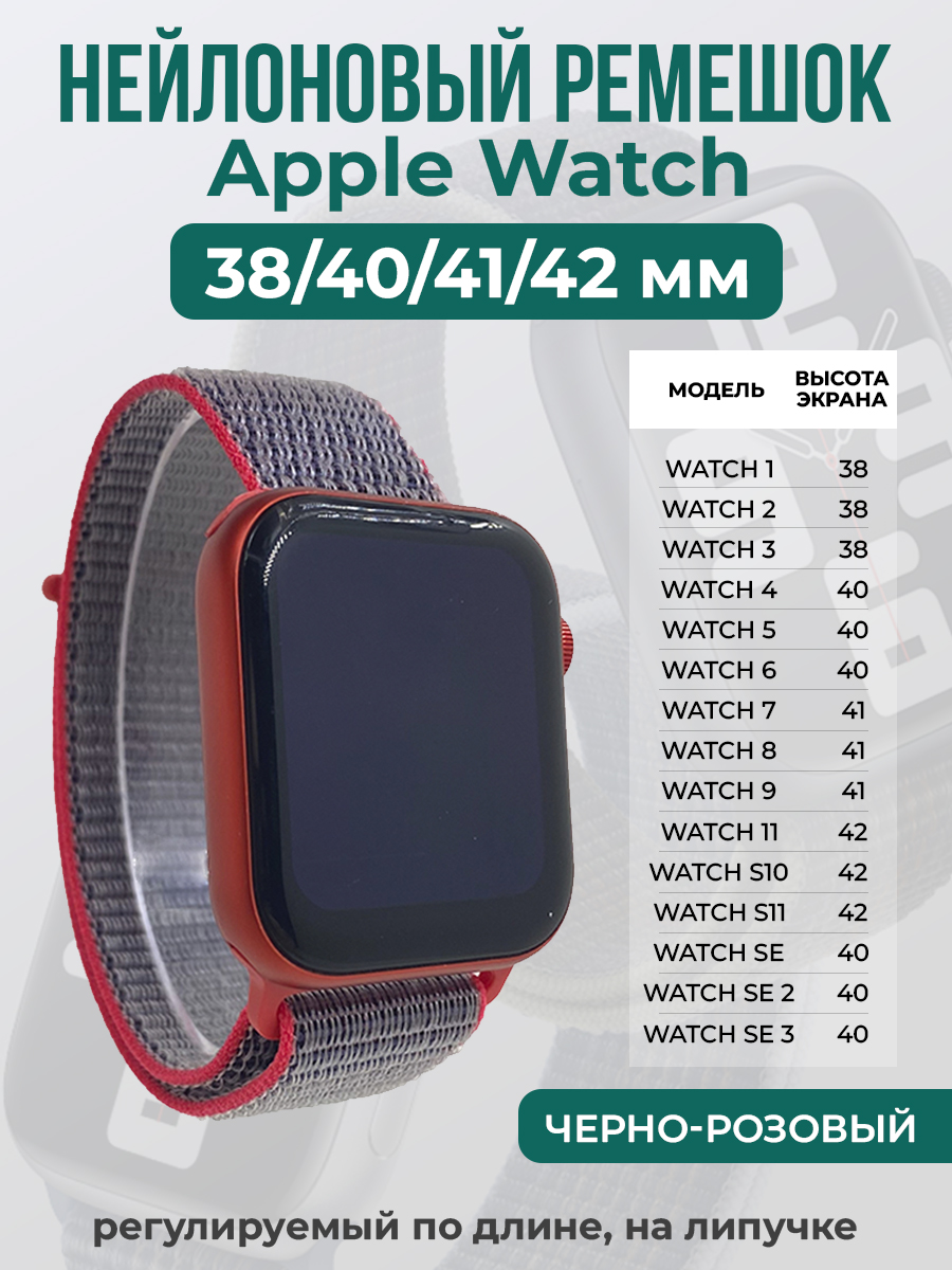 Нейлоновый ремешок на липучке для Apple Watch 1-9 / SE (38/40/41 мм), регулируемый по длине, черно-розовый