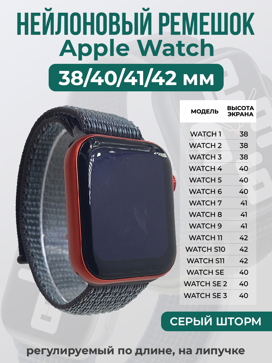 Нейлоновый ремешок на липучке для Apple Watch 1-9 / SE (38/40/41 мм), регулируемый по длине, серый штормсерый шторм