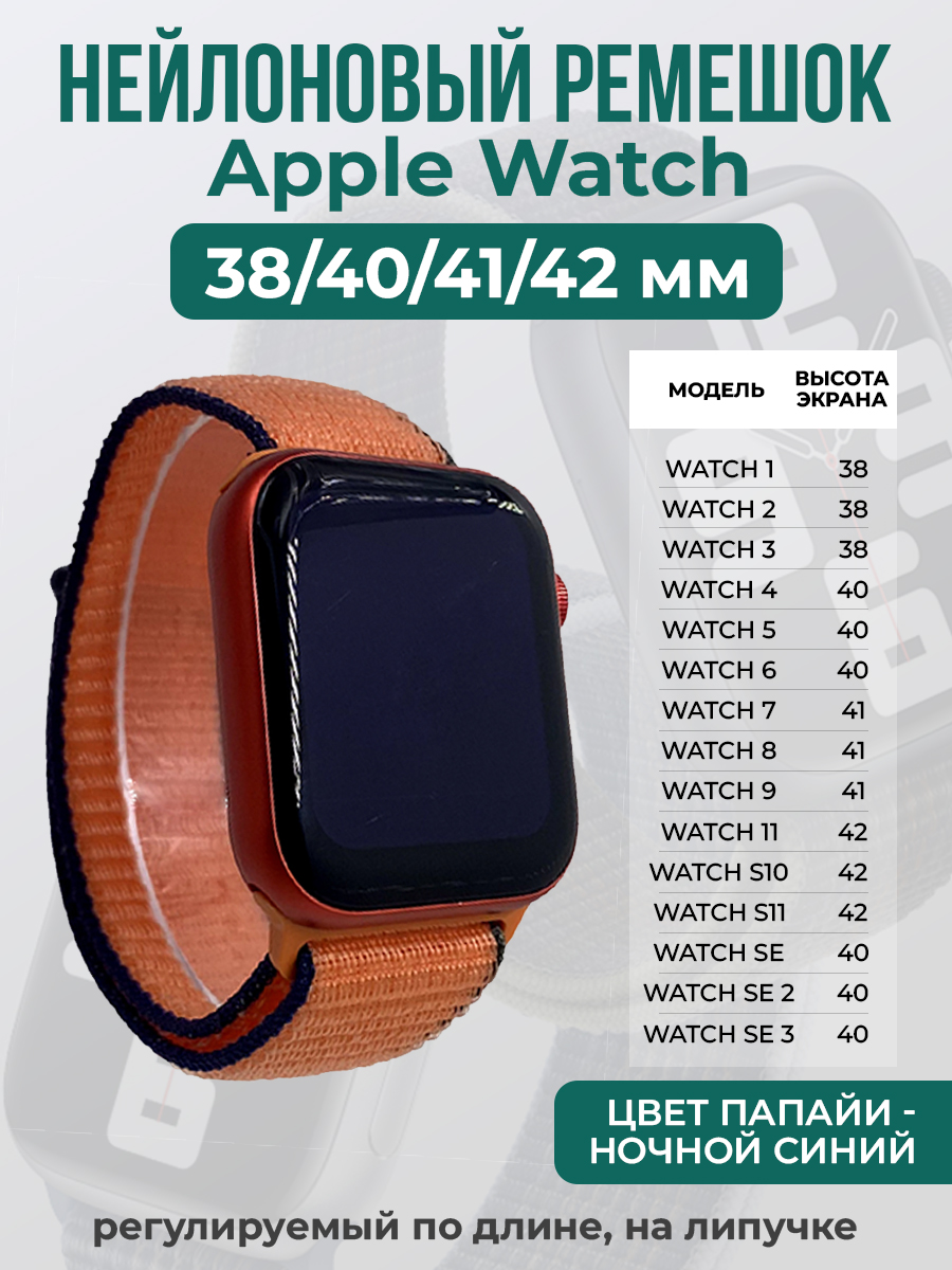 Нейлоновый ремешок на липучке для Apple Watch 1-9 / SE (38/40/41 мм), регулируемый по длине, цвет папайи - ночной синий