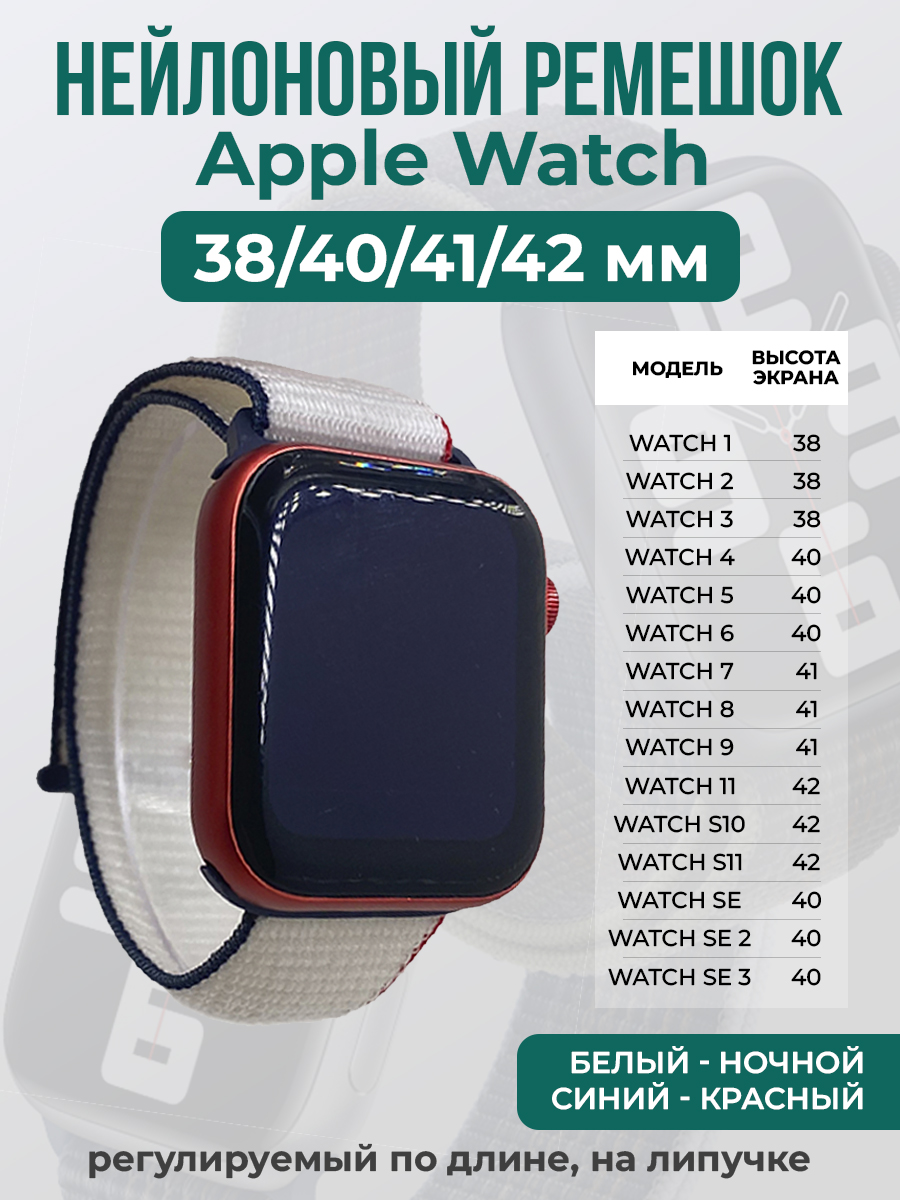 Нейлоновый ремешок на липучке для Apple Watch 1-9 / SE (38/40/41 мм), регулируемый по длине, белый - ночной синий - красный
