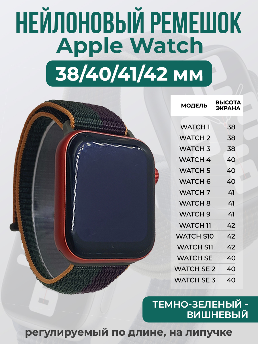 Нейлоновый ремешок на липучке для Apple Watch 1-9 / SE /SE 3 (38/40/41 мм), S10/S11 42 мм, регулируемый по длине, темно-зеленый - вишневый