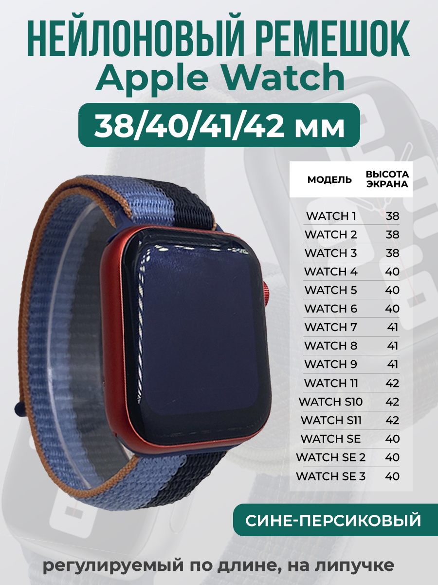 Нейлоновый ремешок на липучке для Apple Watch 1-9 / SE /SE 3 (38/40/41 мм), S10/S11 42 мм, регулируемый по длине, сине-персиковый
