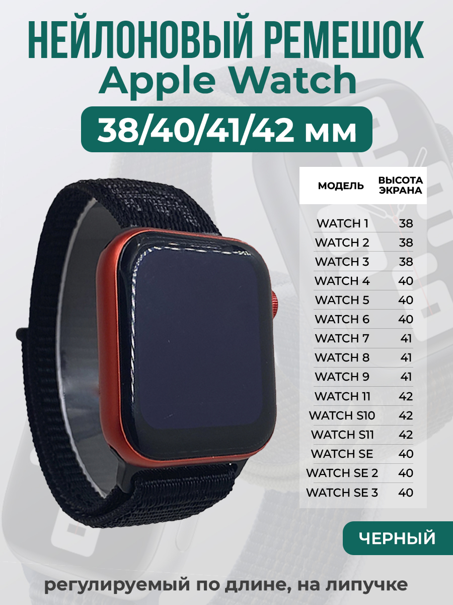 Нейлоновый ремешок на липучке для Apple Watch 1-9 / SE /SE 3 (38/40/41 мм), S10/S11 42 мм, регулируемый по длине, черный