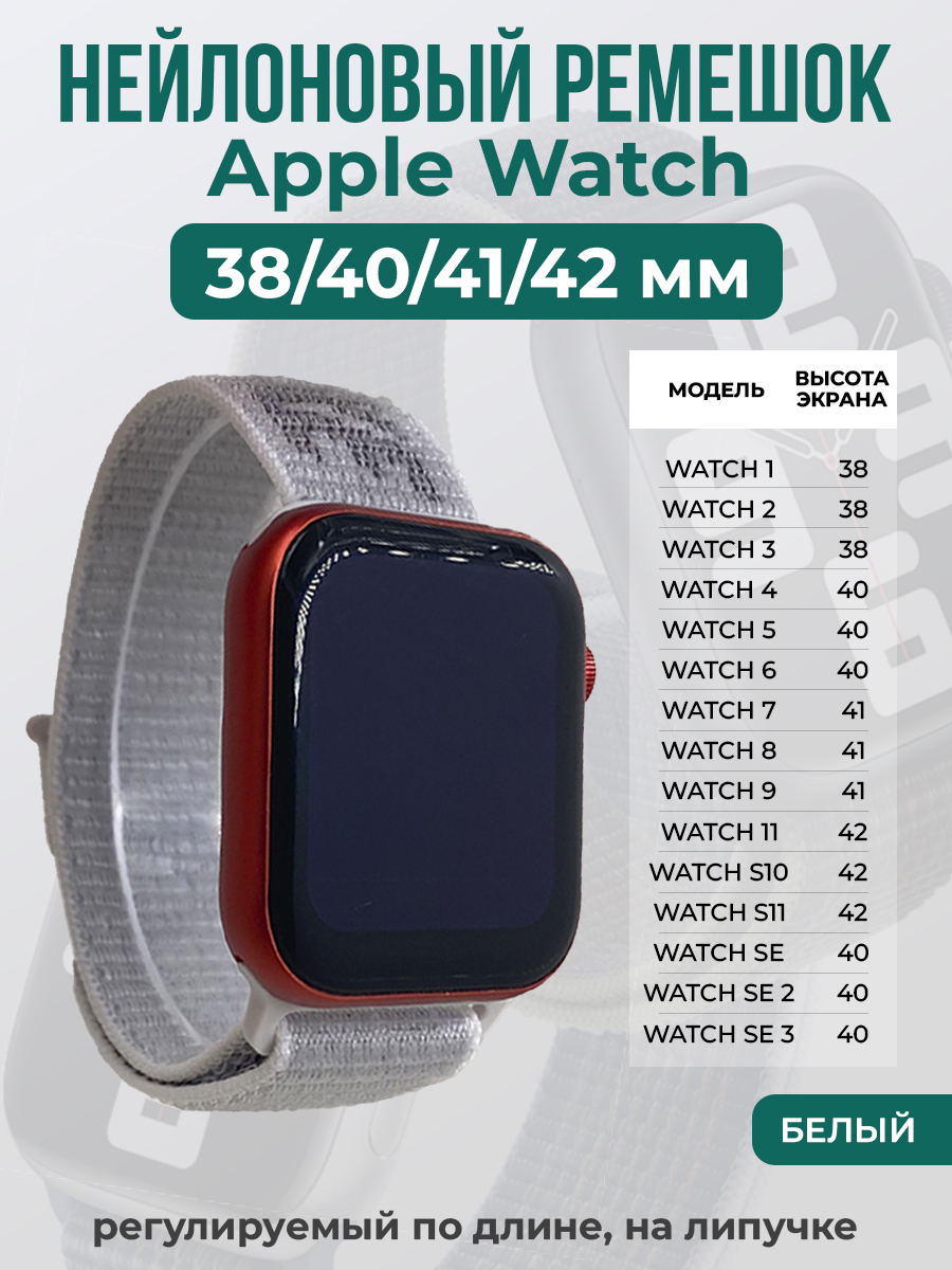 Нейлоновый ремешок на липучке для Apple Watch 1-9 / SE /SE 3 (38/40/41 мм), S10/S11 42 мм, регулируемый по длине, белый