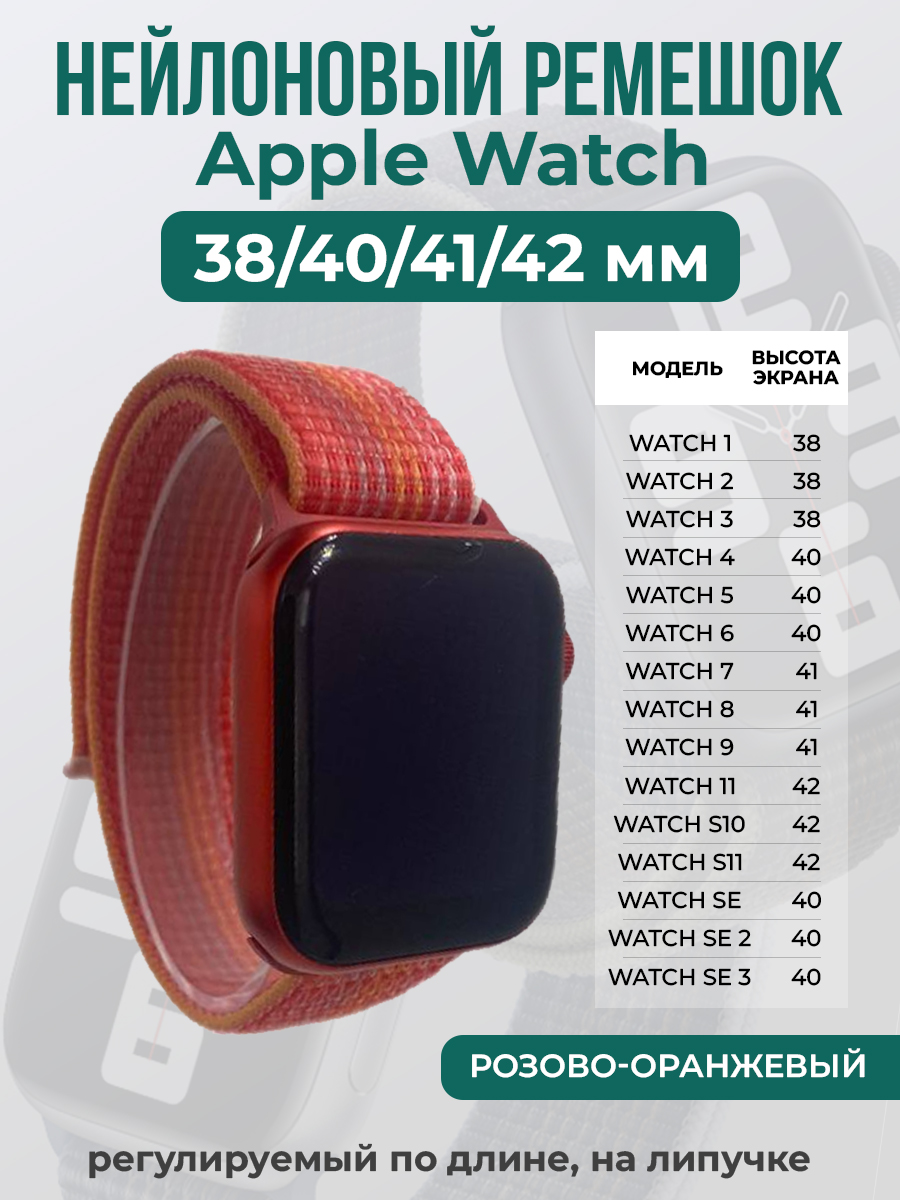 Нейлоновый ремешок на липучке для Apple Watch 1-9 / SE /SE 3 (38/40/41 мм), S10/S11 42 мм, регулируемый по длине, розово-оранжевый