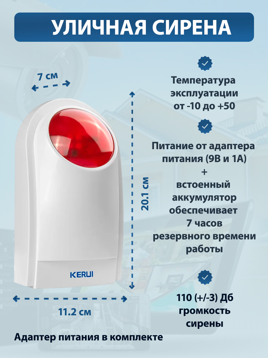 Уличная сирена для охранная сигнализации Kerui W181 / W202. Громкость сирены - 110 Дб. При ее срабатывании придет уведомление не только на систему охраны, но и будет звуковое сопровождение (очень громкое).