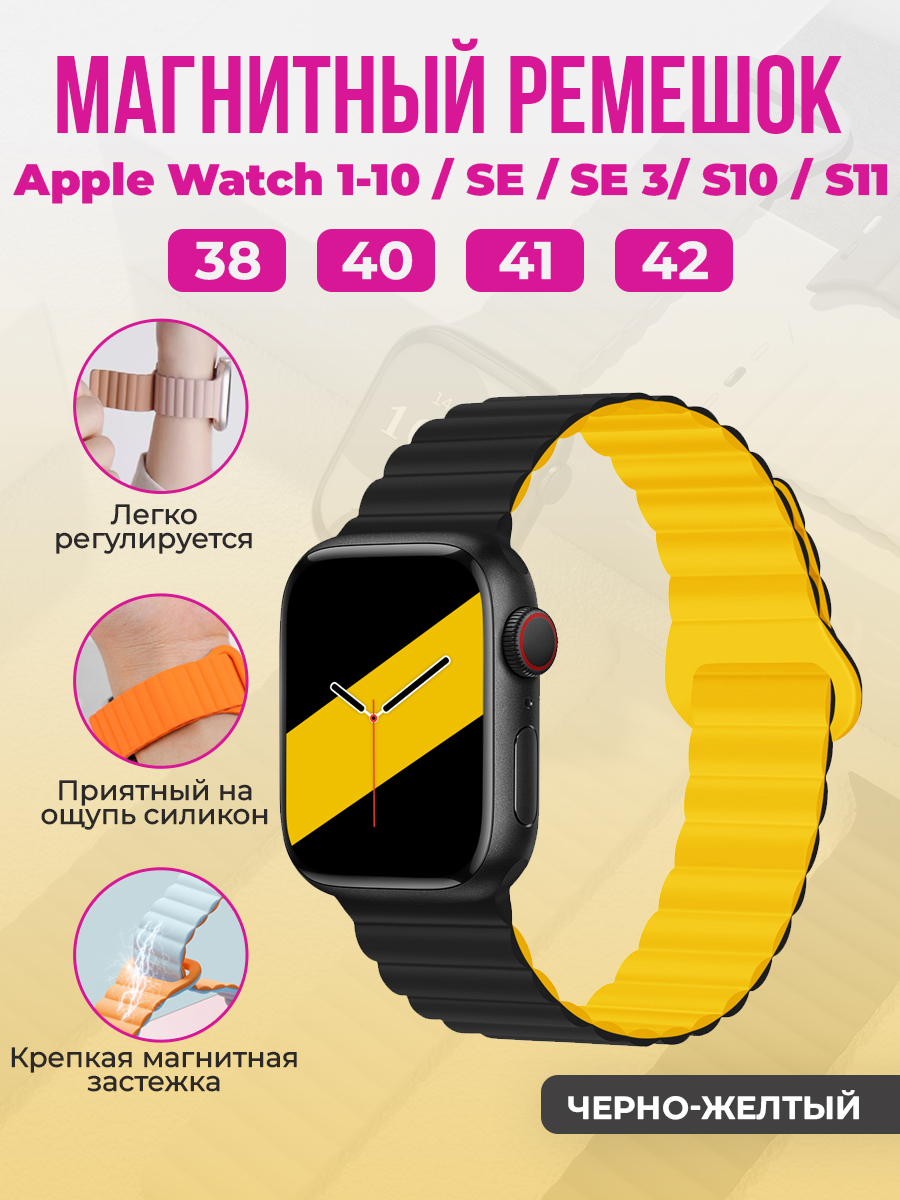 Магнитный силиконовый ремешок для Apple Watch 1-9 / SE / SE 3 (38/40/41 мм), 11, S10/S11, 42 мм, черно-желтый