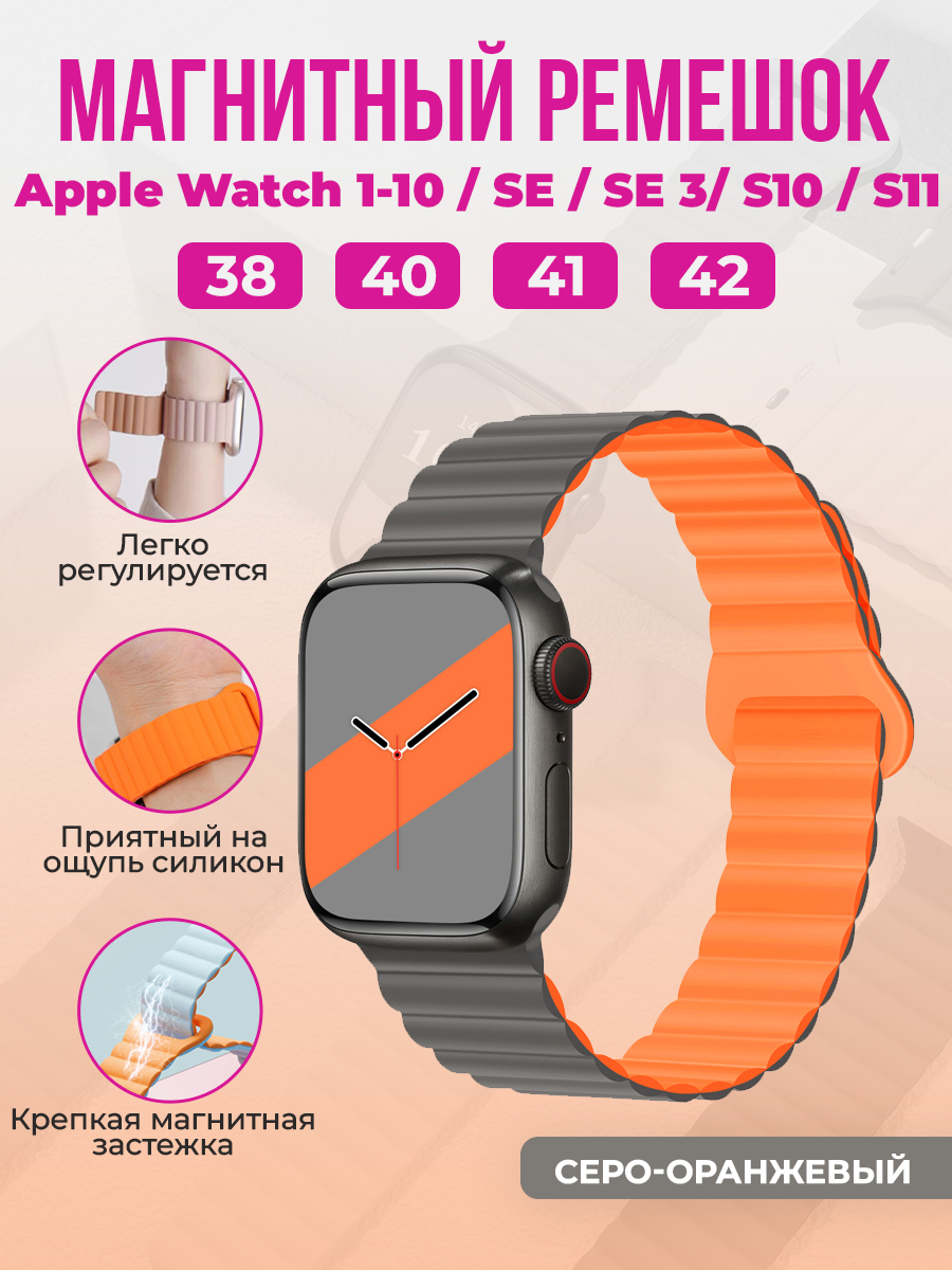 Магнитный силиконовый ремешок для Apple Watch 1-9 / SE / SE 3 (38/40/41 мм), 11, S10/S11, 42 мм, серо-оранжевый