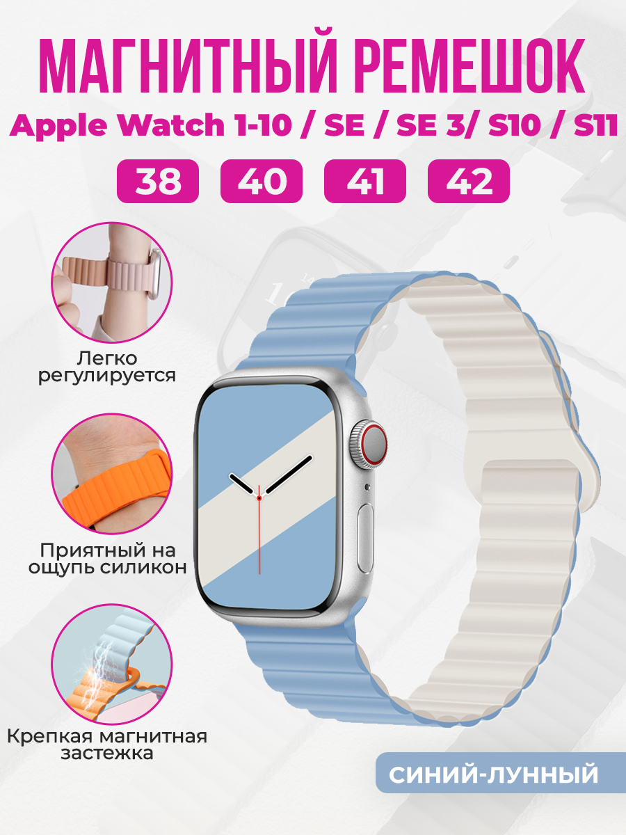 Магнитный силиконовый ремешок для Apple Watch 1-9 / SE / SE 3 (38/40/41 мм), 11, S10/S11, 42 мм, синий-лунный
