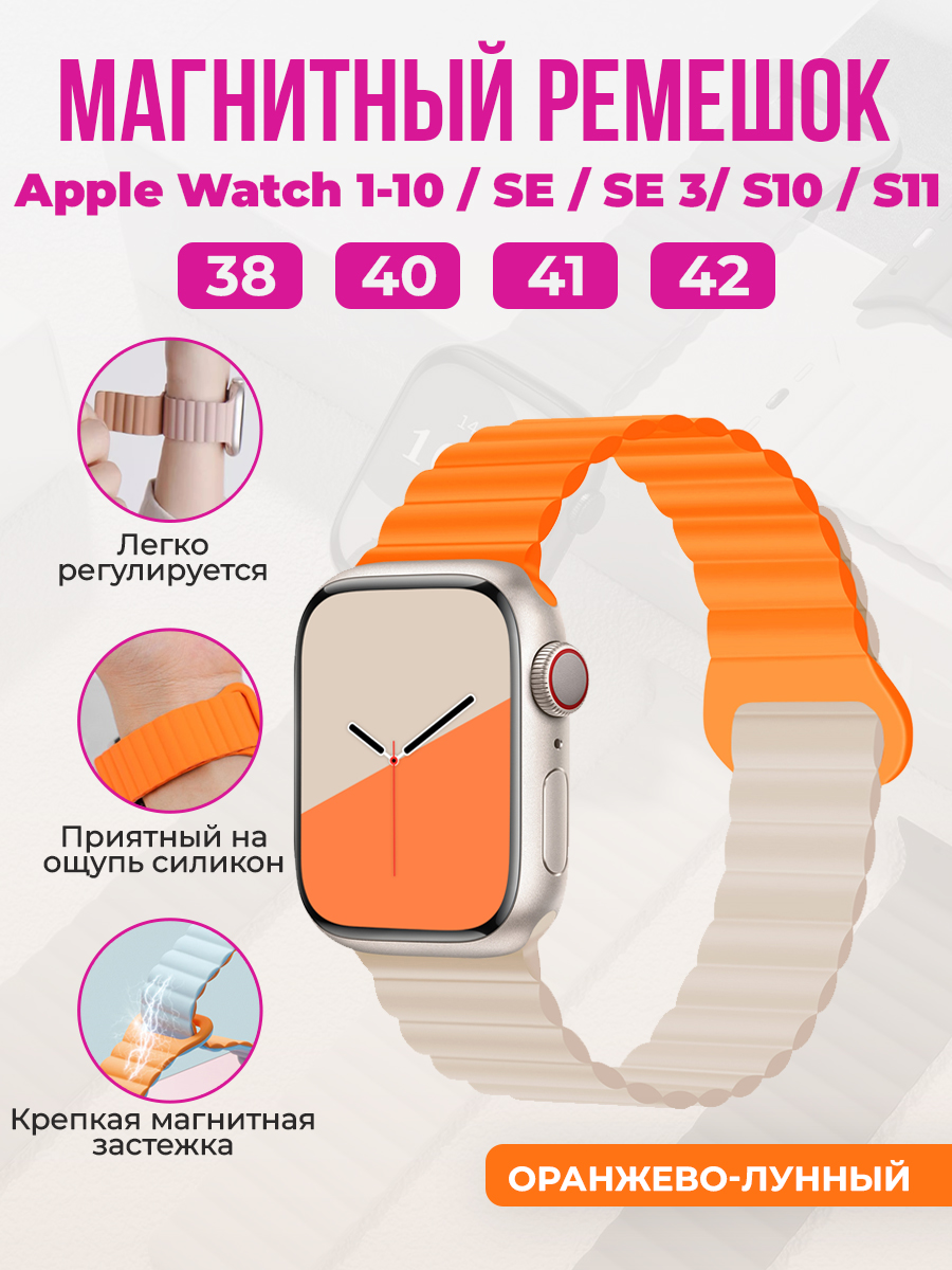 Магнитный силиконовый ремешок для Apple Watch 1-9 / SE / SE 3 (38/40/41 мм), 11, S10/S11, 42 мм, оранжево-лунный