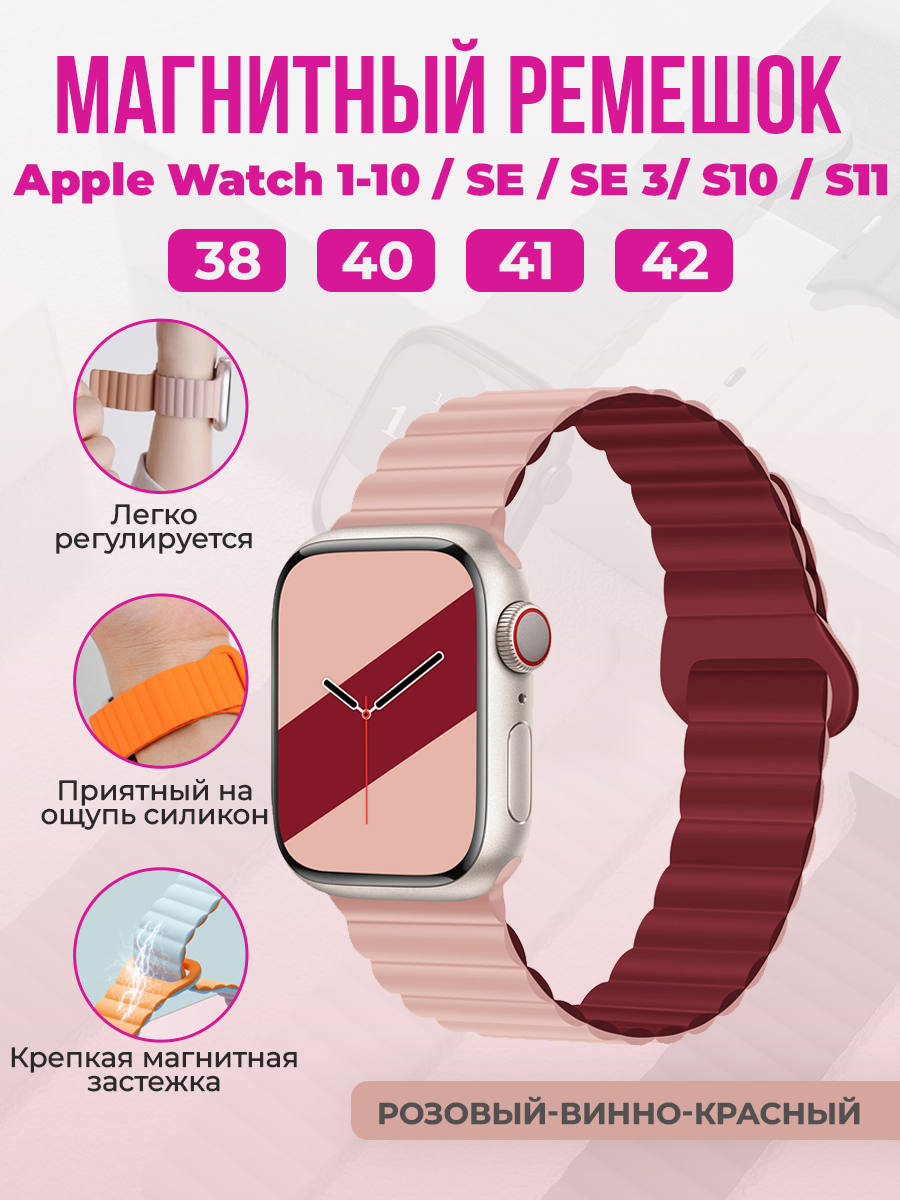 Магнитный силиконовый ремешок для Apple Watch 1-9 / SE / SE 3 (38/40/41 мм), 11, S10/S11, 42 мм, розовый-винно-красный