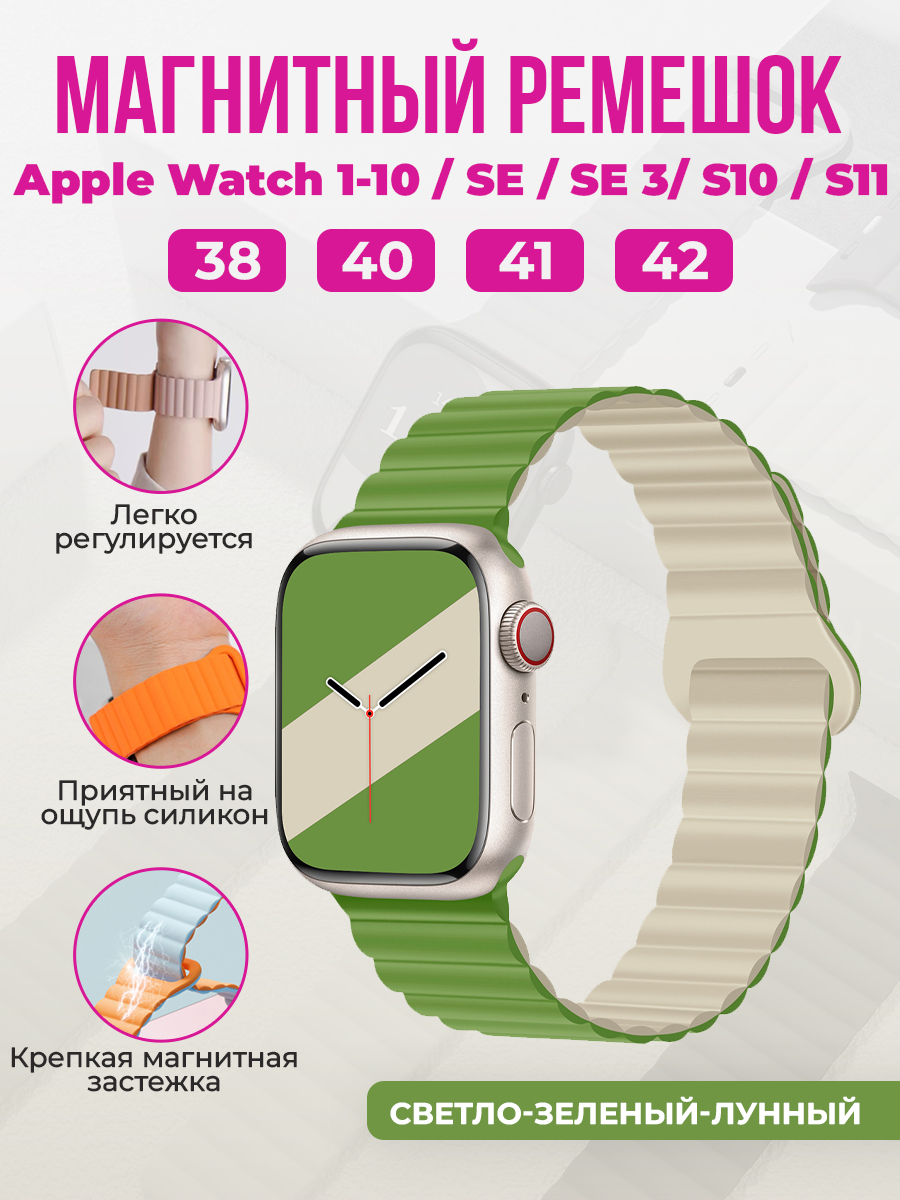 Магнитный силиконовый ремешок для Apple Watch 1-9 / SE / SE 3 (38/40/41 мм), 11, S10/S11, 42 мм, светло-зеленый-лунный