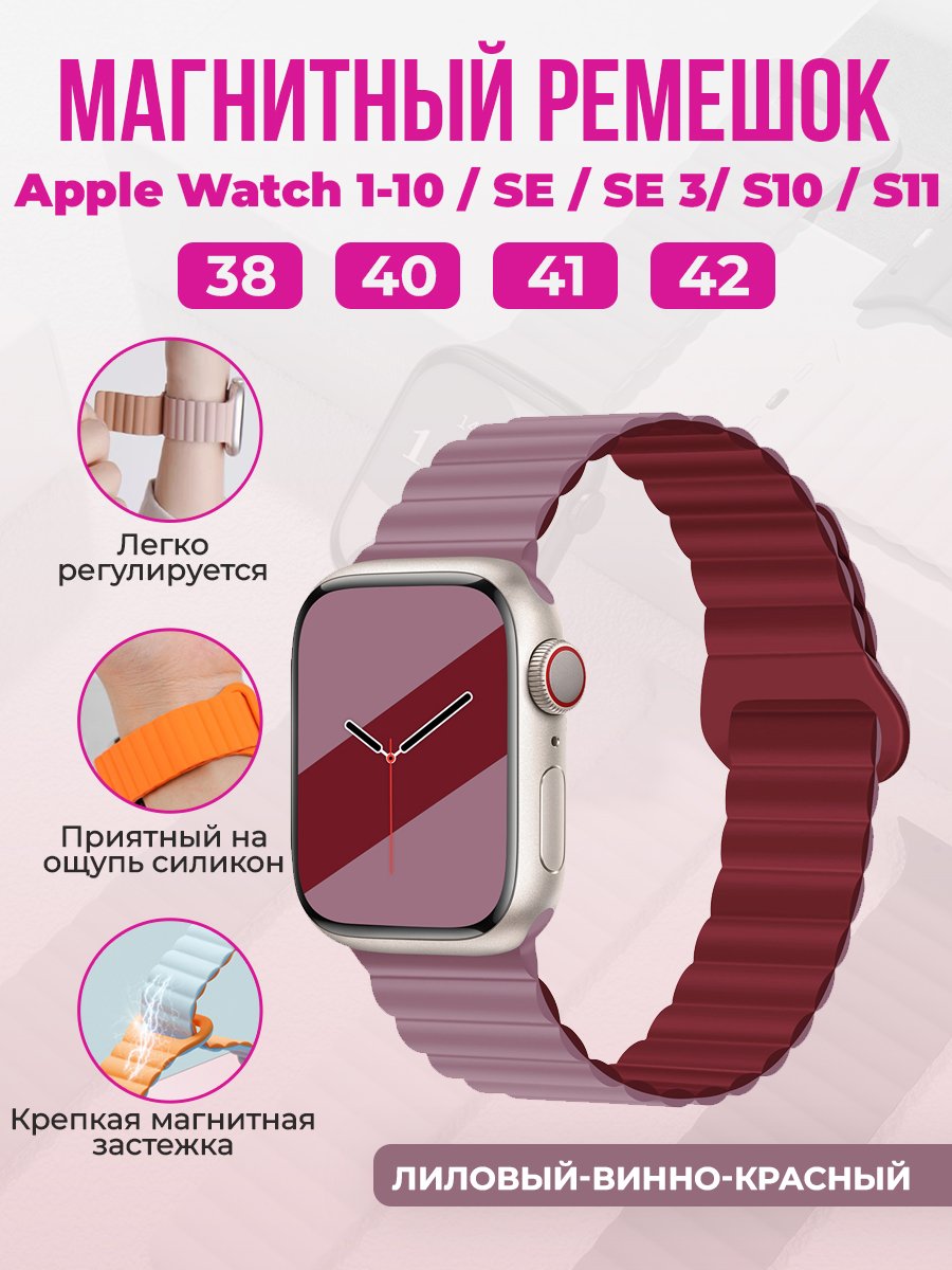 Магнитный силиконовый ремешок для Apple Watch 1-9 / SE / SE 3 (38/40/41 мм), 11, S10/S11, 42 мм, лиловый-винно-красный