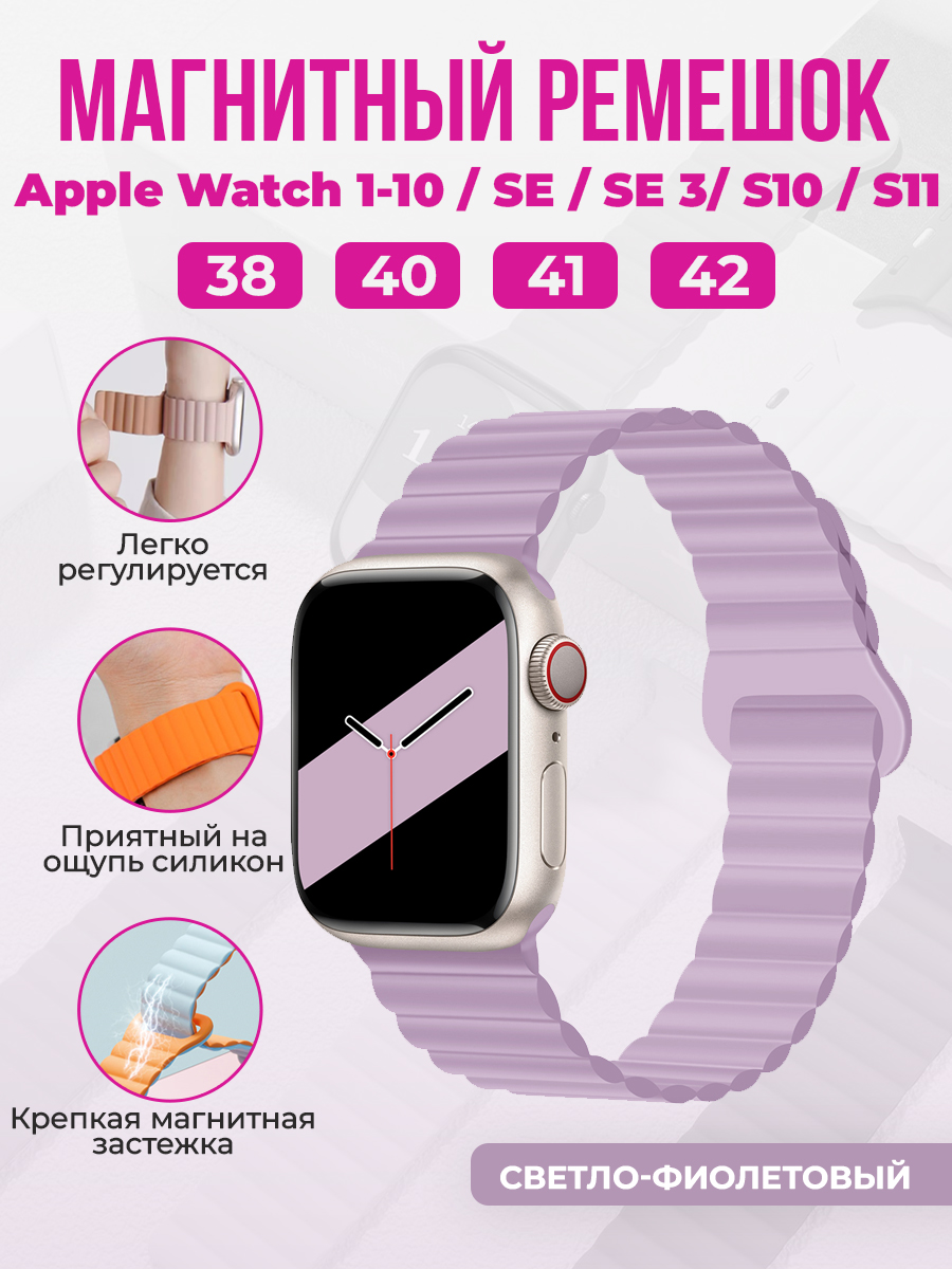 Магнитный силиконовый ремешок для Apple Watch 1-9 / SE / SE 3 (38/40/41 мм), 11, S10/S11, 42 мм, светло-фиолетовый