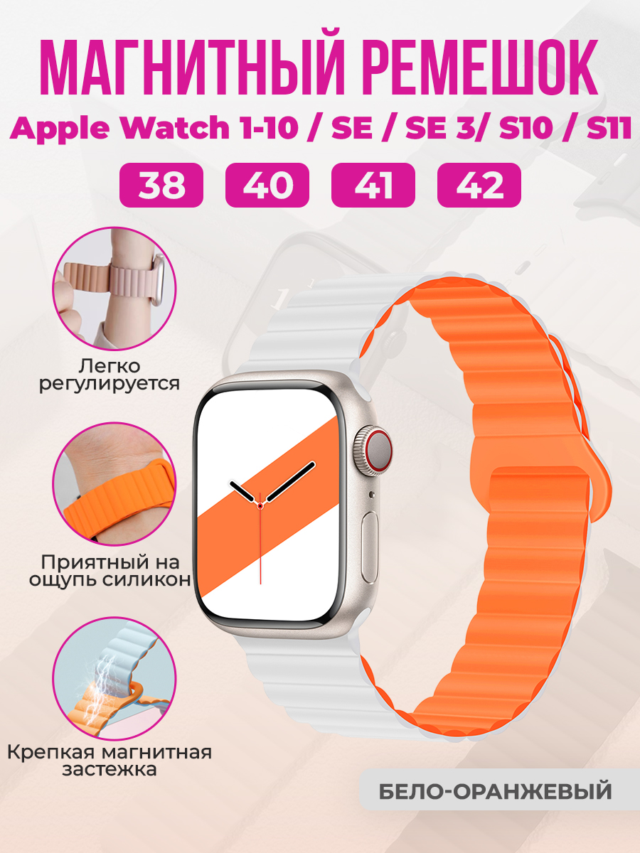 Магнитный силиконовый ремешок для Apple Watch 1-9 / SE / SE 3 (38/40/41 мм), 11, S10/S11, 42 мм, бело-оранжевый