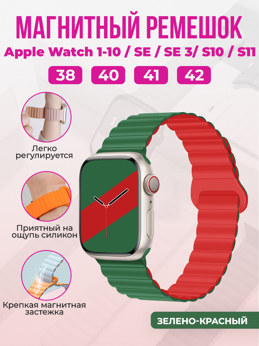 Магнитный силиконовый ремешок для Apple Watch 1-9 / SE / SE 3 (38/40/41 мм), 11, S10/S11, 42 мм, зелено-красный