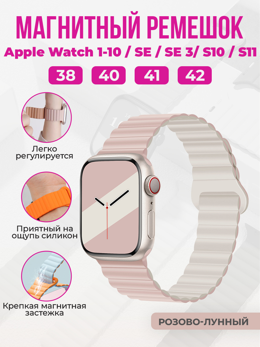 Магнитный силиконовый ремешок для Apple Watch 1-9 / SE / SE 3 (38/40/41 мм), 11, S10/S11, 42 мм, розово-лунный
