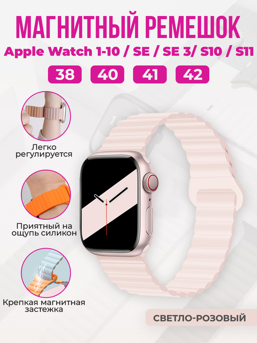 Магнитный силиконовый ремешок для Apple Watch 1-9 / SE / SE 3 (38/40/41 мм), 11, S10/S11, 42 мм, светло-розовый