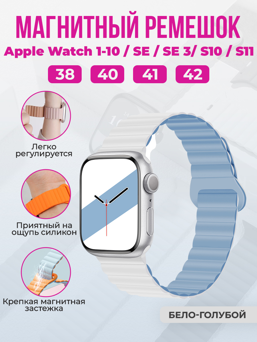 Магнитный силиконовый ремешок для Apple Watch 1-9 / SE / SE 3 (38/40/41 мм), 11, S10/S11, 42 мм, бело-голубой