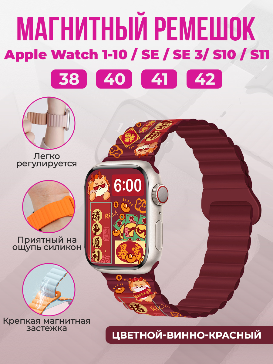 Магнитный силиконовый ремешок для Apple Watch 1-9 / SE / SE 3 (38/40/41 мм), 11, S10/S11, 42 мм, цветной-винно-красный