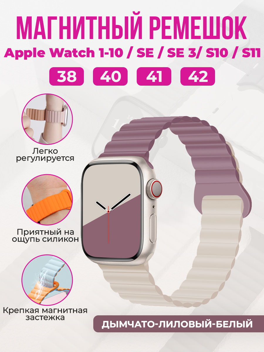 Магнитный силиконовый ремешок для Apple Watch 1-9 / SE / SE 3 (38/40/41 мм), 11, S10/S11, 42 мм, дымчато-лиловый-белый