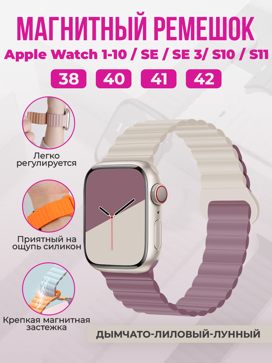 Магнитный силиконовый ремешок для Apple Watch 1-9 / SE / SE 3 (38/40/41 мм), 11, S10/S11, 42 мм, дымчато-лиловый-лунный
