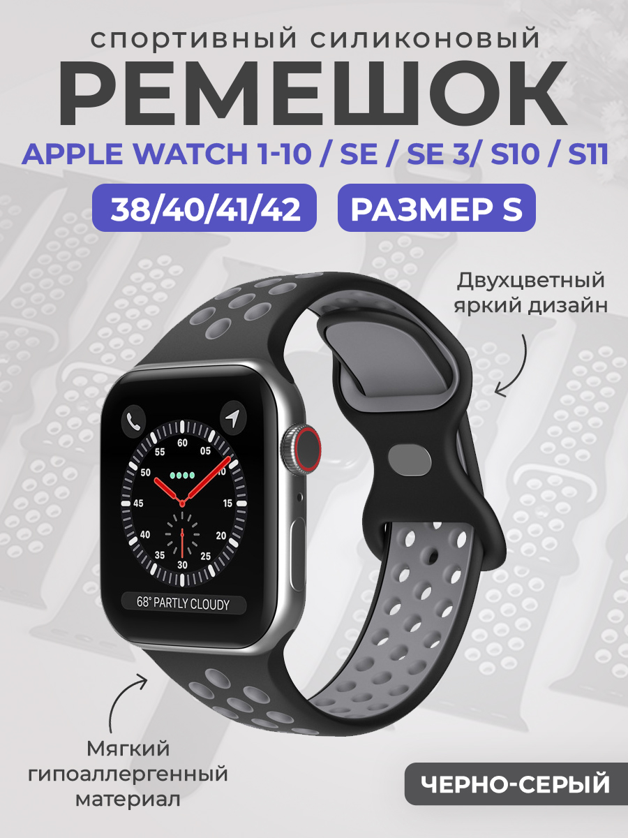 Спортивный силиконовый ремешок Apple Watch 1-9 / SE / SE 3 (38/40/41 мм), 11/S10/S11, 42мм, размер S, черно-серый