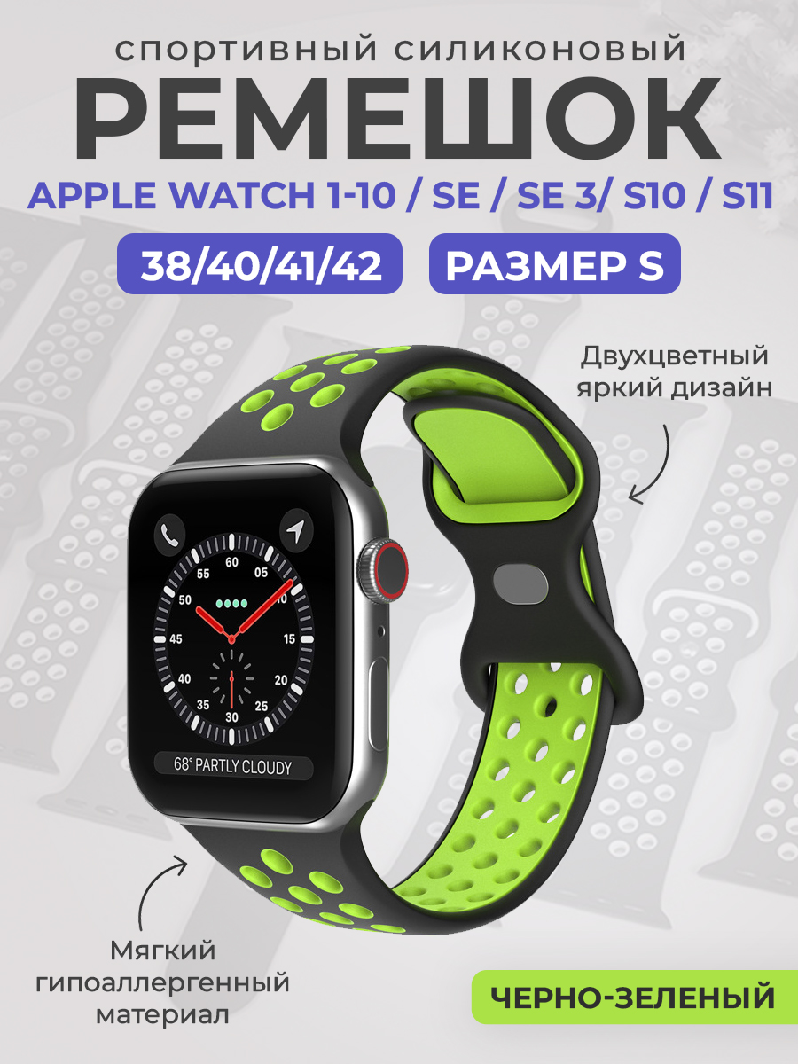 Спортивный силиконовый ремешок Apple Watch 1-9 / SE / SE 3 (38/40/41 мм), 11/S10/S11, 42мм, размер S, черно-зеленый