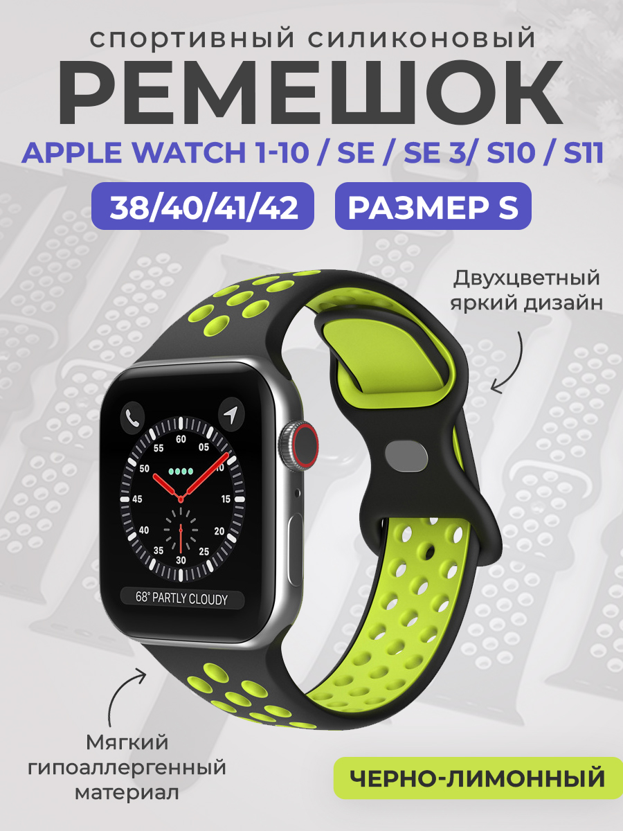 Спортивный силиконовый ремешок Apple Watch 1-9 / SE / SE 3 (38/40/41 мм), 11/S10/S11, 42мм, размер S, черно-лимонный