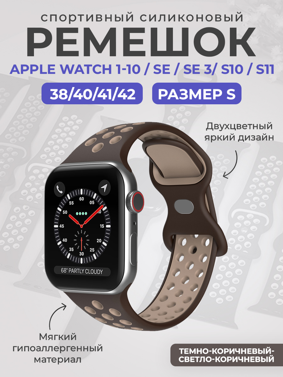 Спортивный силиконовый ремешок Apple Watch 1-9 / SE / SE 3 (38/40/41 мм), 11/S10/S11, 42мм, размер S, темно-коричневый-светло-коричневый