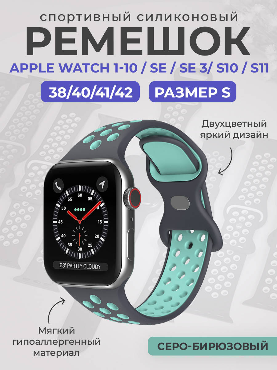 Спортивный силиконовый ремешок Apple Watch 1-9 / SE / SE 3 (38/40/41 мм), 11/S10/S11, 42мм, размер S, серо-бирюзовый