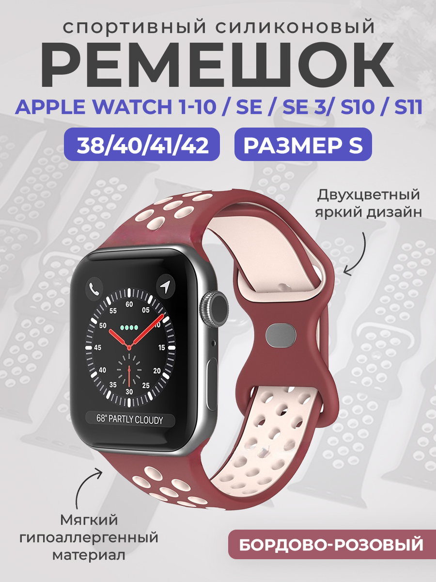 Спортивный силиконовый ремешок Apple Watch 1-9 / SE / SE 3 (38/40/41 мм), 11/S10/S11, 42мм, размер S, бордово-розовый