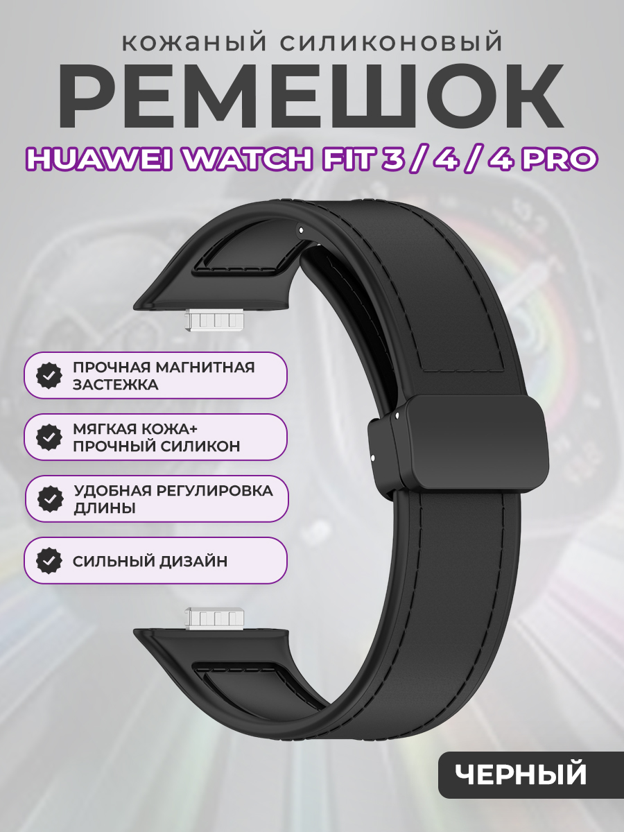 Кожаный силиконовый ремешок для Huawei Watch Fit 3/4/4 Pro, с магнитной застежкой, черный