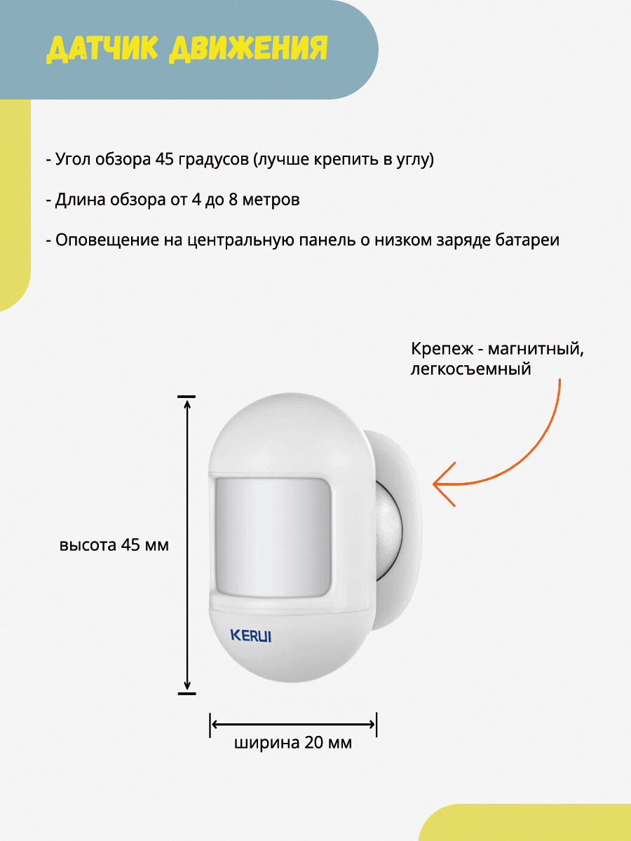 Подключение только к сети WIFI 2.4 ГГц, 5 ГГц не поддерживается.Батарейки подходящие для датчика движения "CR2450 3V" - 1шт., для датчика открытия дверей/окон "23А 12V" - 1шт., для датчика дыма "ААА 1.5V" - 2шт.