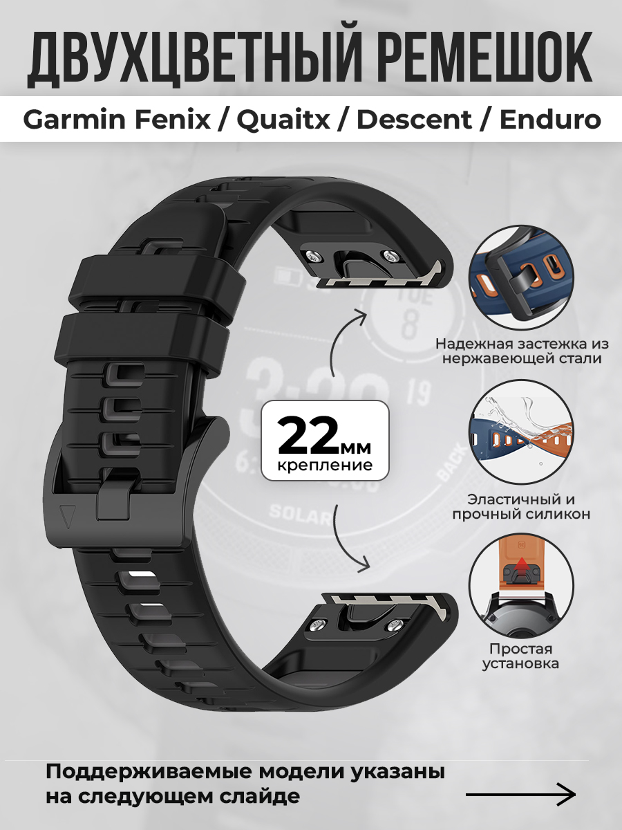 Двухцветный ремешок для Garmin Fenix, Garmin Instinct, Garmin Epix и Garmin Quatix – это идеальный выбор для активных пользователей, которые ценят стиль и функциональность в одном аксессуаре. Этот ремешок разработан так, чтобы не только подчеркнуть внешний вид ваших спортивных часов, но и обеспечить максимальный комфорт при ношении, независимо от того, занимаетесь ли вы спортом, отдыхом на природе или повседневной активностью.