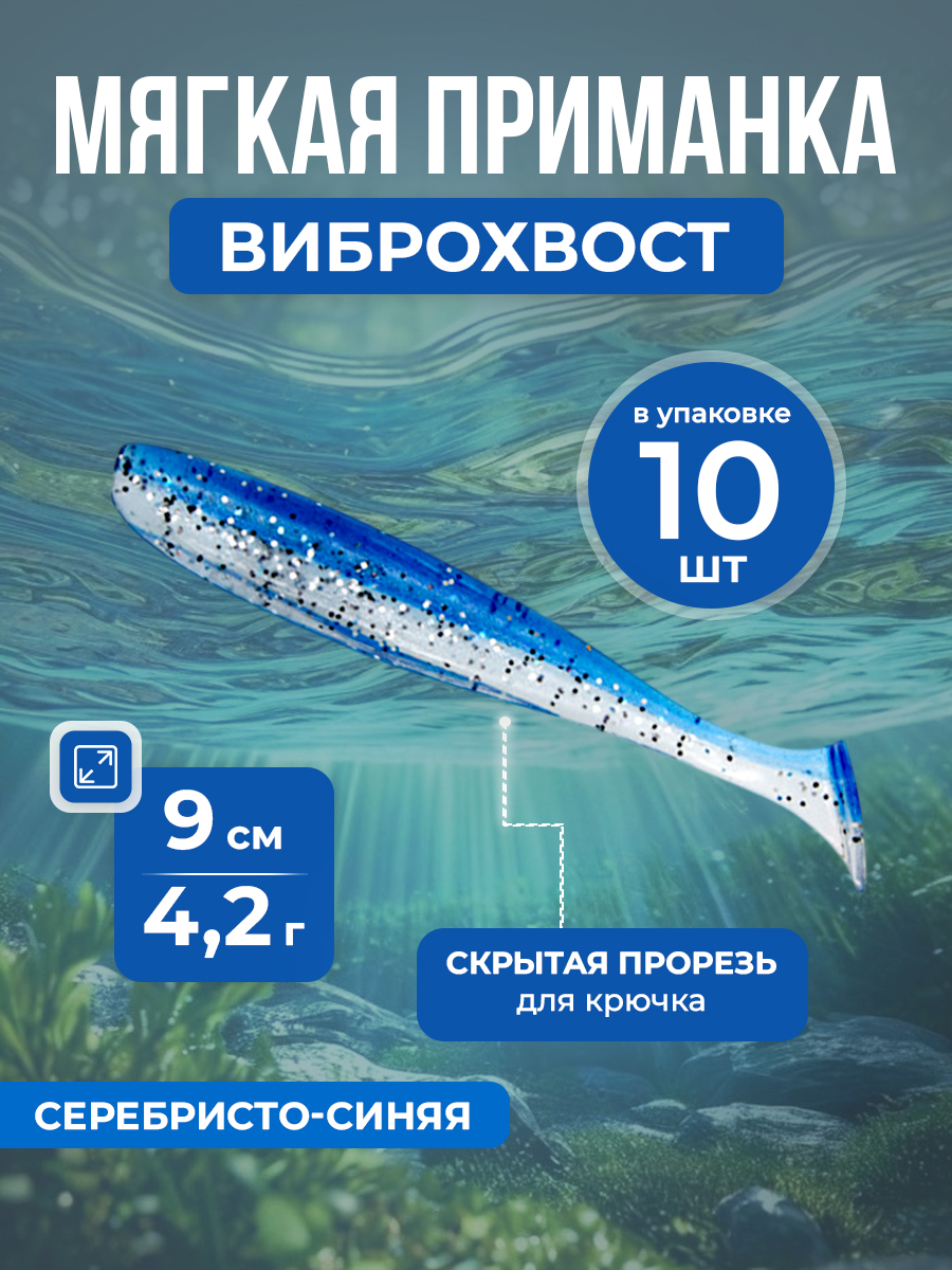 Рыболовная двухцветная мягкая приманка-червяк с Т-образным хвостом, виброхвост (Vibrotail / Soft Swimbait), 9 см/4,2 г, 10 шт, серебристо-синяя