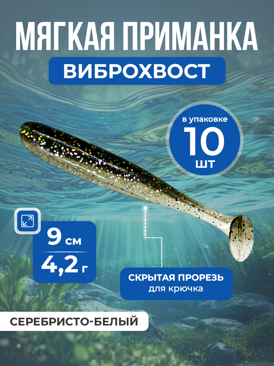 Рыболовная двухцветная мягкая приманка-червяк с Т-образным хвостом, виброхвост (Vibrotail / Soft Swimbait), 9 см/4,2 г, 10 шт, серебристо-белый