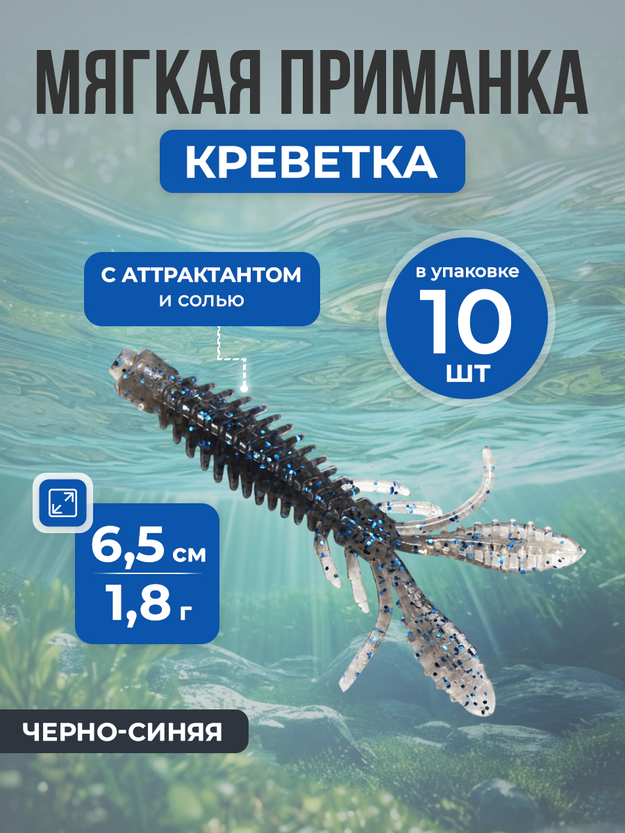 Рыболовная ароматизированная, соленая, плавающая мягкая приманка, имитация креветки для оснастки NED Rig Shrimp, 6,5см/1,8 г, 10 шт, черно-синяя
